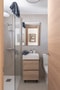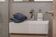 Vardagsrummet är genomtänkt möblerat med en bekväm bäddsoffa som passar utmärkt för såväl vardagsbruk som övernattande gäster, samt en möbel mitt emot soffan med smart och diskret förvaring. Varje kvadratmeter är utnyttjad på ett effektivt sätt utan att kompromissa med vare sig estetik eller komfort.