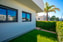 Främre uteplats med grönskande ytor och en bakre terrass i västligt läge med plats för loungegrupp samt solstolar för socialt umgänge.