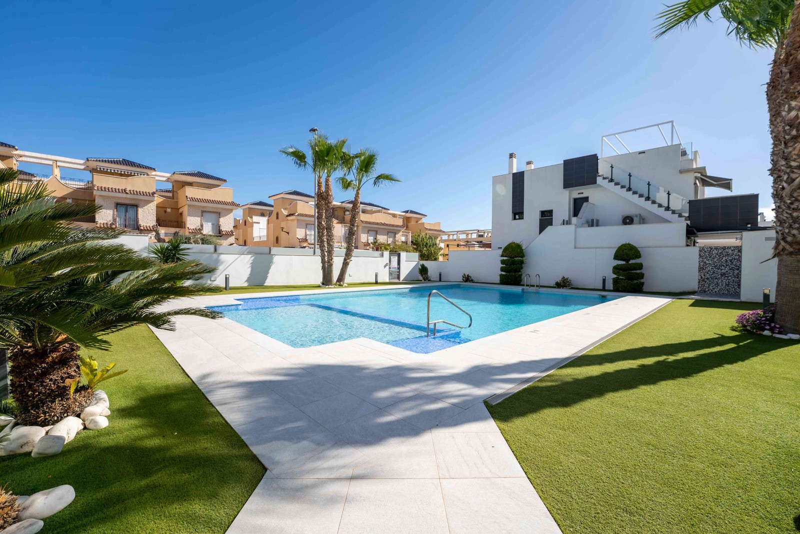 Inom bekvämt gångavstånd finns allt du behöver i vardagen: supermarket, apotek, bageri, butiker, gym och vårdcentral – samt ett stort utbud av restauranger med både internationellt och spanskt kök. Den vackra marinan i Torre de la Horadada ligger alldeles i närheten och erbjuder både båtplatser och en charmig strandpromenad med restauranger vid vattnet. På bara några minuters bilfärd når du dessutom det populära köpcentret La Zenia Boulevard, flera golfbanor i världsklass samt smidiga motorvägsförbindelser till flygplatserna i Alicante och Murcia.