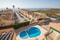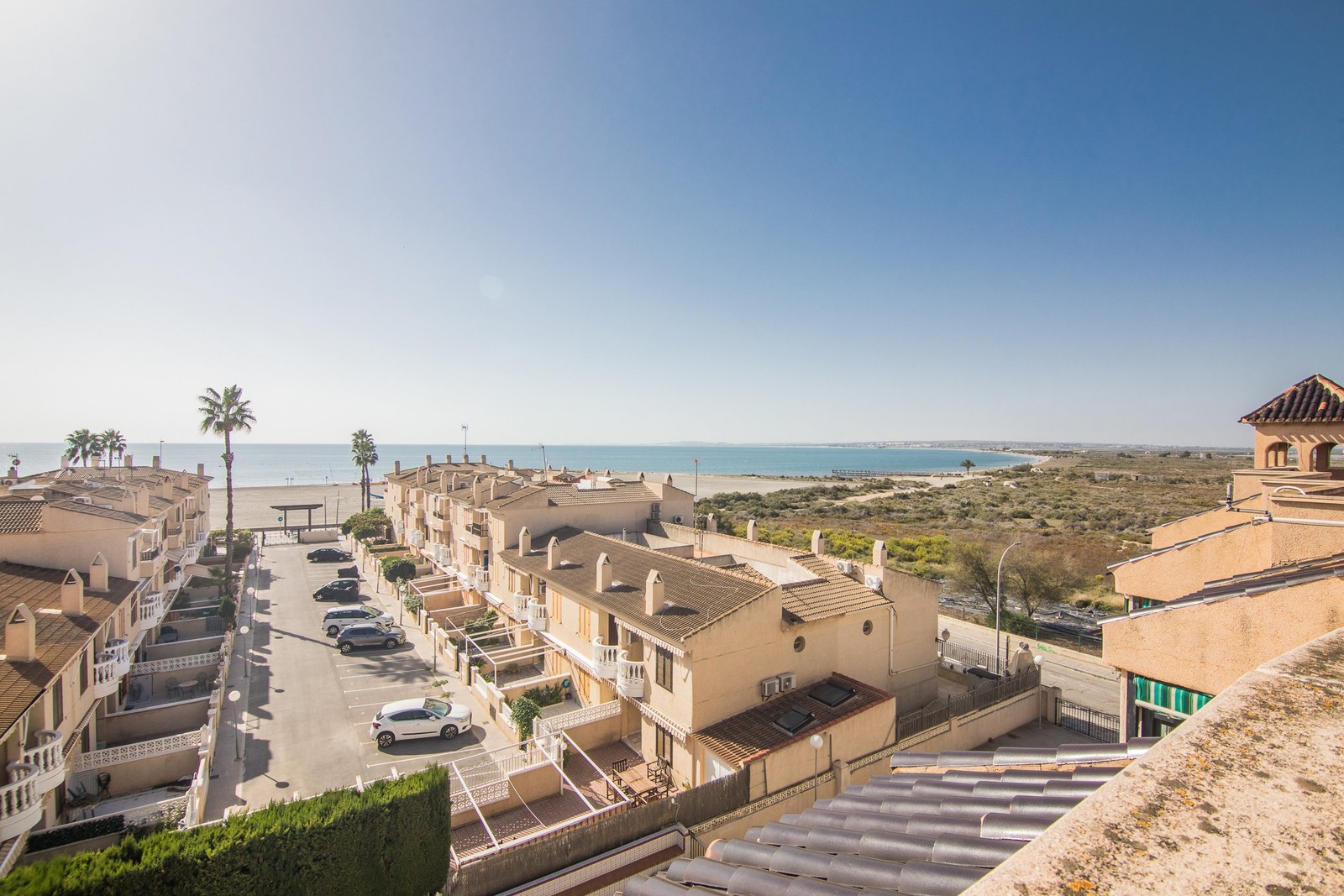 Ljus lägenhet med terrass nära stranden, med pool och parkering.