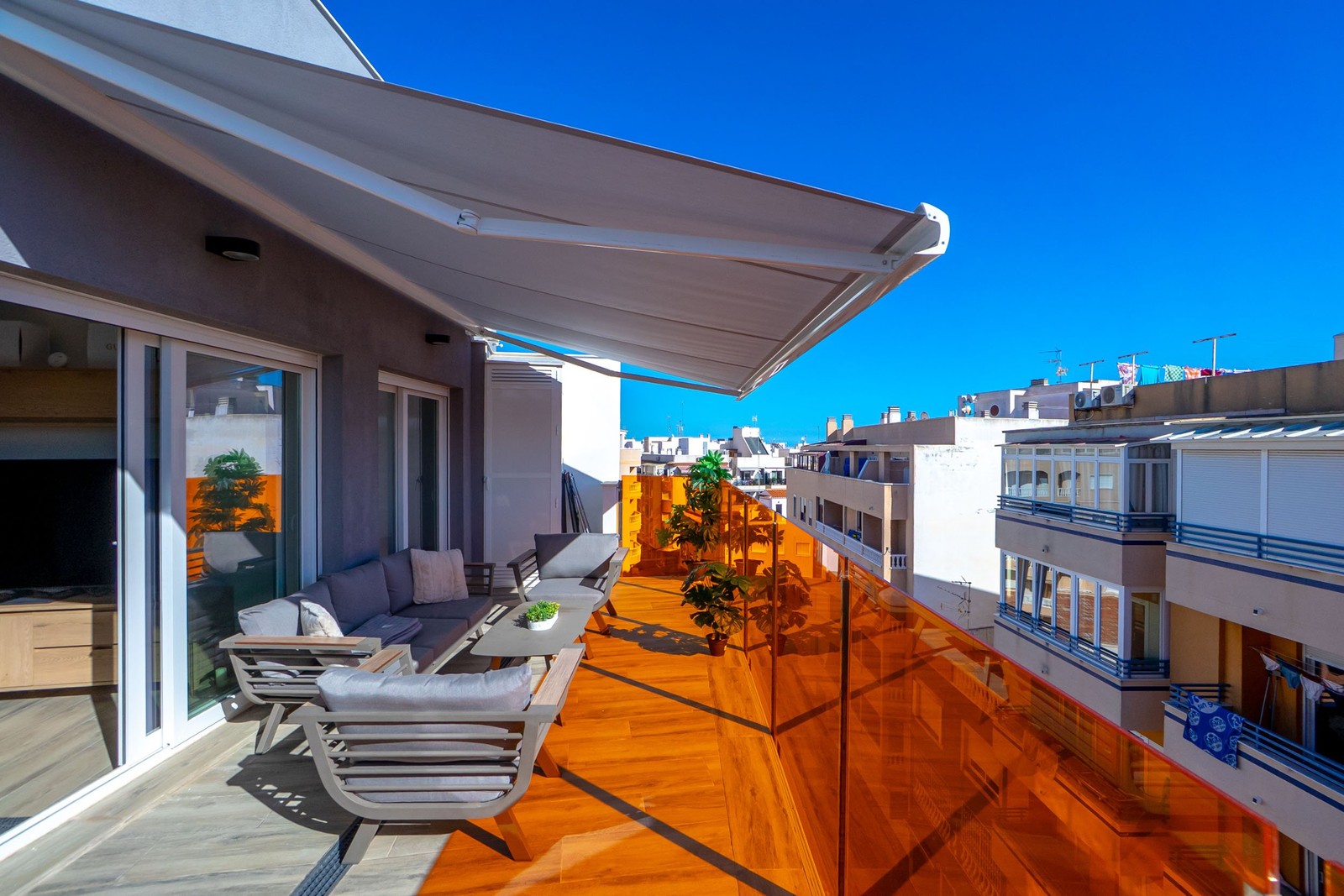 Via en trappa från balkongen tar du dig upp till bostadens imponerande privata takterrass på hela 68 m². Här öppnar sig ett eget paradis i solen – helt privat trots det centrala läget. Terrassen är utrustad med utedusch och utekök, perfekt för långa sommardagar och sociala kvällar med familj och vänner. Utsikten över stadens takåsar och det glittrande Medelhavet gör upplevelsen komplett. Här finns utrymme för både loungemöbler, solstolar, grill och middagsbord – allt du behöver för att skapa din egen oas i hjärtat av Torrevieja.