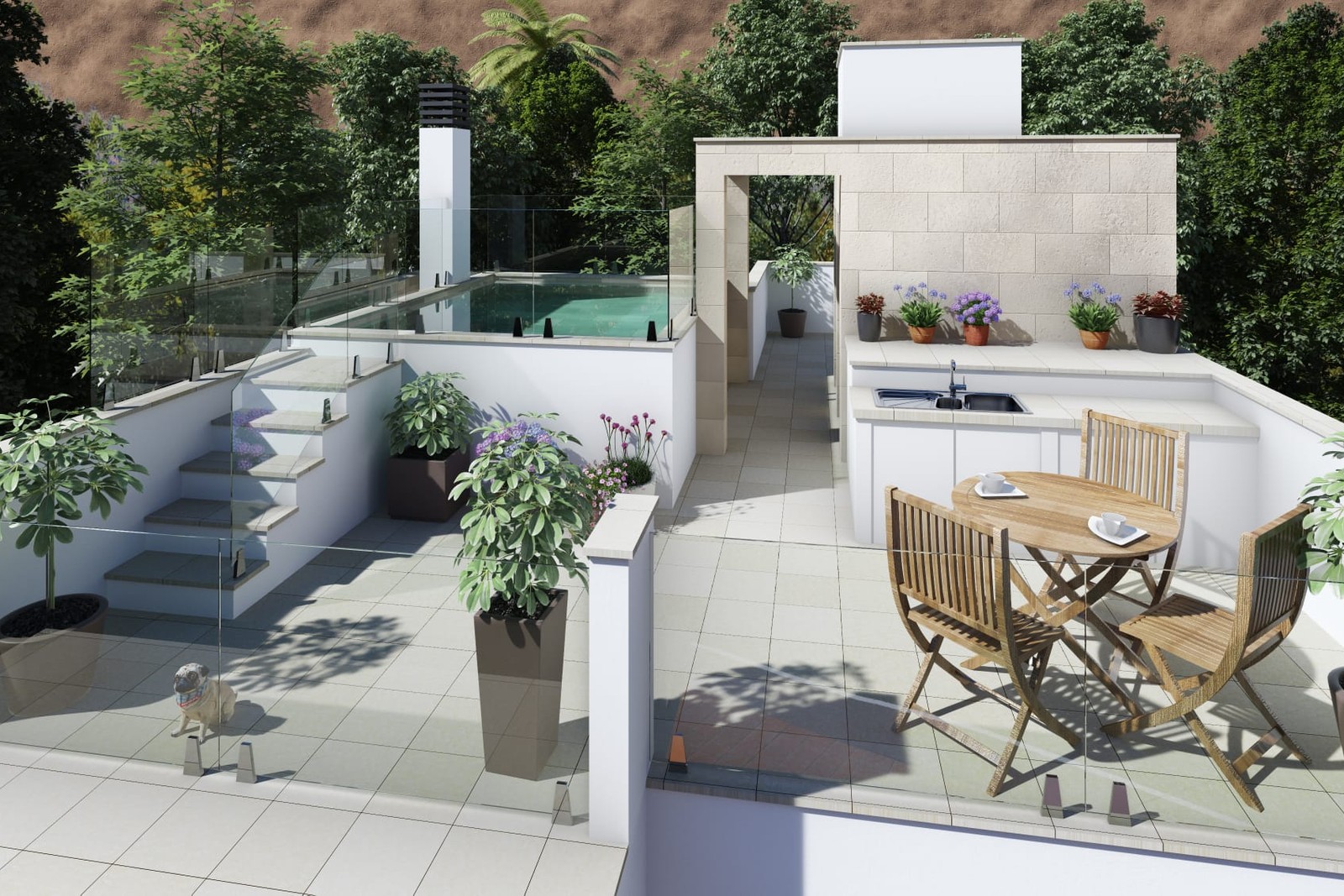 Husen har takterrass, privat pool, garage och hiss mellan alla våningsplan.