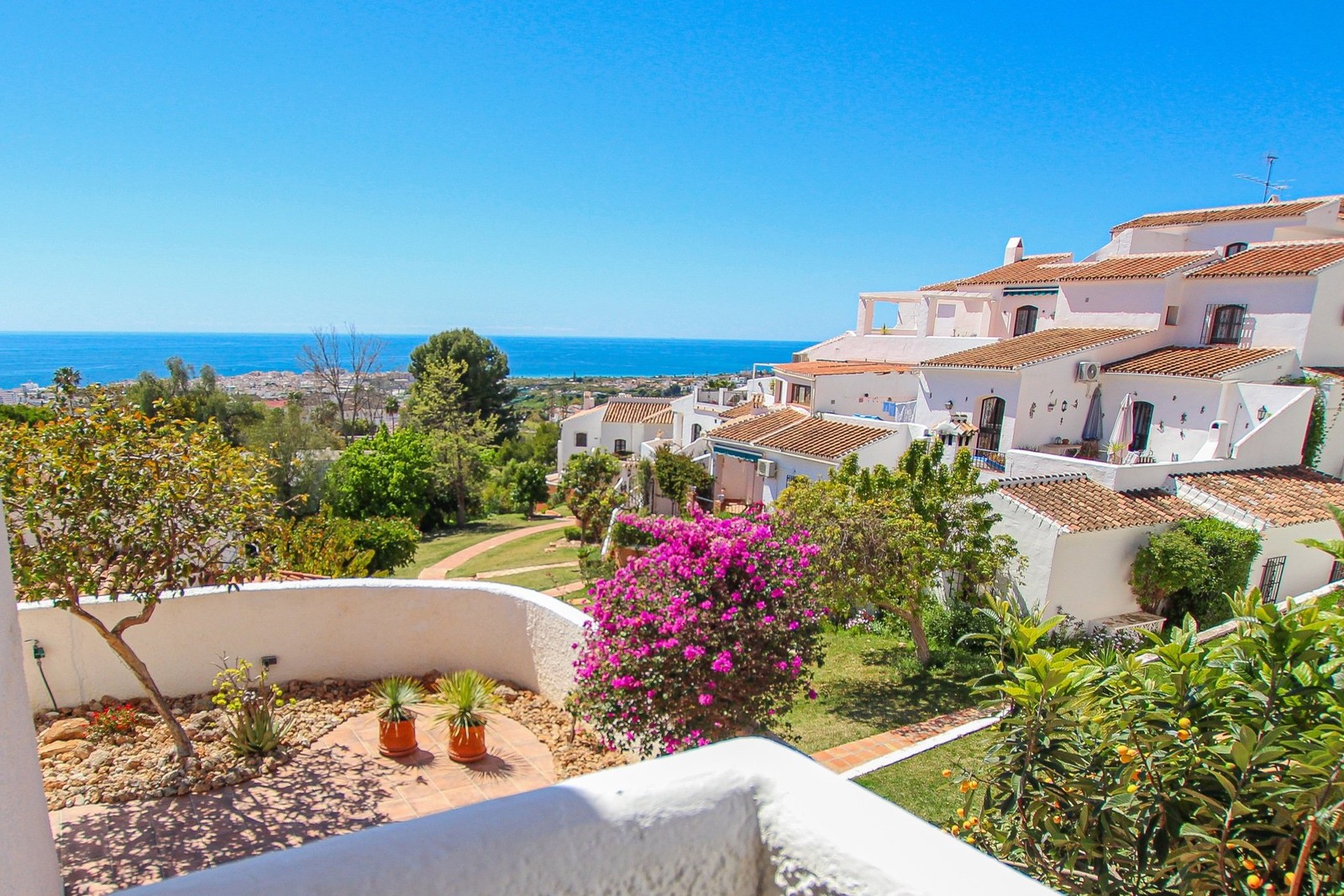 Utomhus möts du av stora, härliga terrasser där du kan njuta av solen, umgänge och den storslagna utsikten över havet – en perfekt plats för både avkoppling och sociala tillställningar. Den härliga trädgården har bevattningssystem och är mycket lättskött.