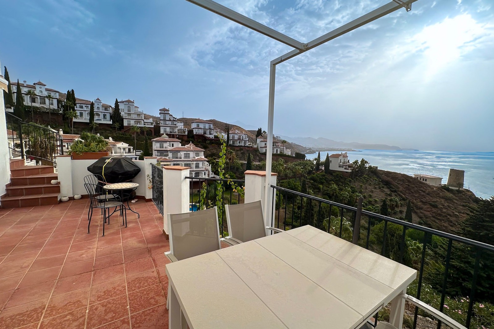 Bostaden har två rymliga terrasser, totalt 58kvm, på olika våningsplan med imponerande utsikt över hav, kust och berg. Här kan man njuta av umgänge och många soltimmar året runt.