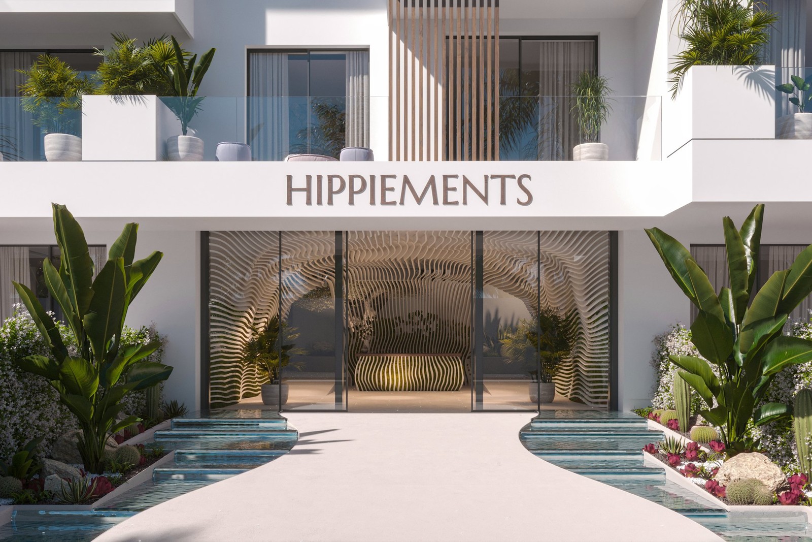 Det arkitektoniska konceptet hos HIPPIEMENTS kombinerar modern design med ö-typiska accenter. Förutom speciella element som natursten, trä, glas och vertikala trädgårdar erbjuder HIPPIEMENTS många höjdpunkter för framtida ägare. I HIPPIEMENTS kombineras tradition och lyx till en spännande blandning som erbjuder en plats för gemenskap och integritet för sina invånare. Kompakt eller rymlig, med egen takterrass eller privat trädgård – varje lägenhet erbjuder sin alldeles unika charm och bär ett ikoniskt namn från hippietiden istället för att ha ett vanligt lägenhetsnummer.