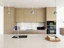 • Sofistikerad design: Ett ljust vardagsrum med öppen planlösning med fönster från golv till tak rinner ut i ett exklusivt kök av Gunni och Trentino.
