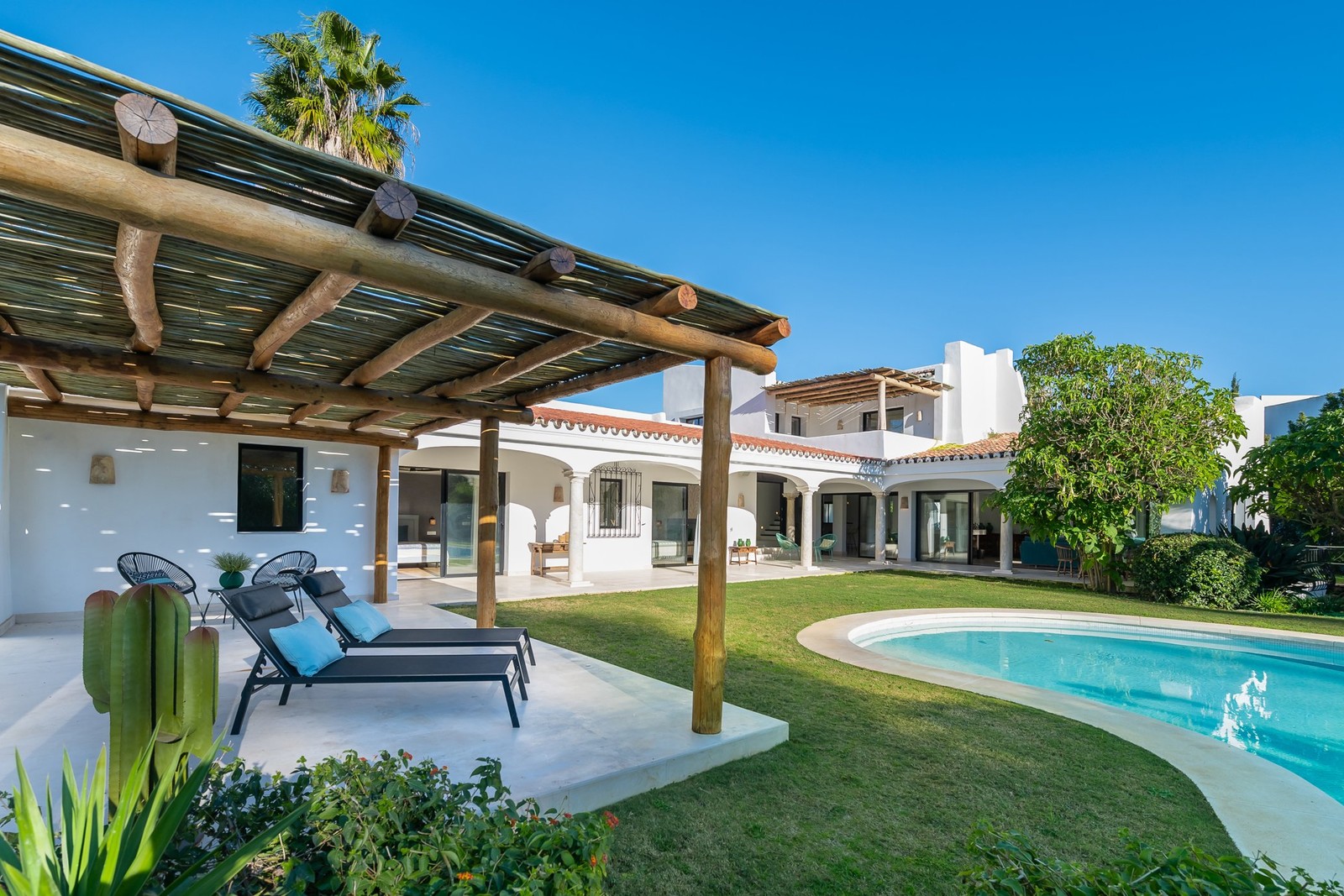 Helrenoverad villa i bohemisk stil i prestigefyllda Guadalmina Baja. Belägen på en tomt på 4 000 m² erbjuder fastigheten ett hus med tre sovrum med eget badrum, ett separat gästhus, frodiga trädgårdar, en stor pool och en utbyggnadspotential på 300 m² – en blandning av tidlös charm och modern lyx bara några steg från stranden och golfbanan.
