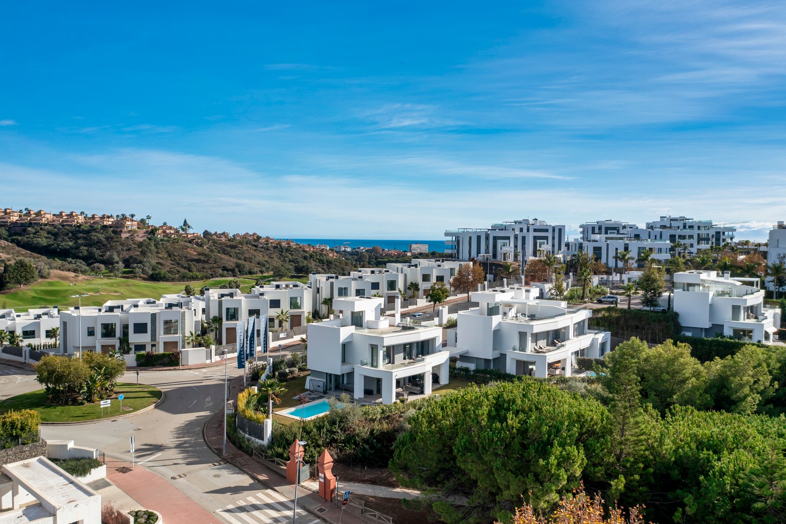Välkommen till denna fantastiska villa om erbjuder fyra sovrum, fem badrum, 217 kvadratmeter stora terrasser, takterrass, samt en 377 kvadratmeter stor trädgård med pool. Här kan du njuta av vacker utsikt över havet, golfbanor, och berg. Villan ligger i en stängd urbanisation med 24 timmars bevakning. En rad lyxiga congierge-tjänster ingår!