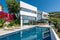 Kliv in i en värld av överflöd i denna lyxiga designvilla. Här välkomnas man av en panoramautsikt över kusten. Det stora sovrummet med eget badrum och dess privata terrass ligger också på denna nivå, tillsammans med ett kontor. Den iögonfallande trappan tar dig till ett rymligt öppet vardagsrum och kök, med en takhöjd på 4,4 meter och fönster från golv till tak. Härifrån finns direkt tillgång till en stor terrass och den uppvärmda infinity-poolen. På denna nivå hittar vi också det andra sovrummet. På nedre plan hittar vi två andra sovrum, båda med eget badrum, ett stort förråd, och en tvättstuga. Våningarna nås via en hiss. Villan har även golvvärme med vatten, domotic system och aerotermia, elektriska persienner, samt parkering för två bilar.
