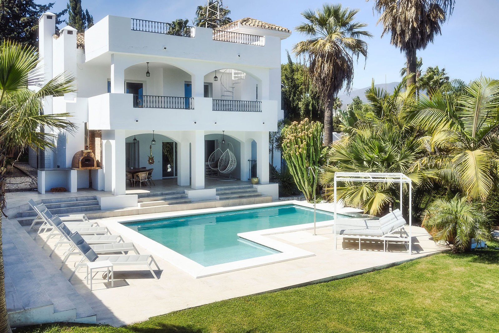Utomhus finns täckta terrasser, pool, och trädgård med bland annat en golfgreen, vilket ger gott om utrymme för friluftsliv och avkoppling. Med sin charmiga andalusiska stil, rymliga interiörer och fängslande utomhusutrymmen erbjuder denna villa en lyxig oas i en av Marbellas mest eftertraktade stadsdelar.