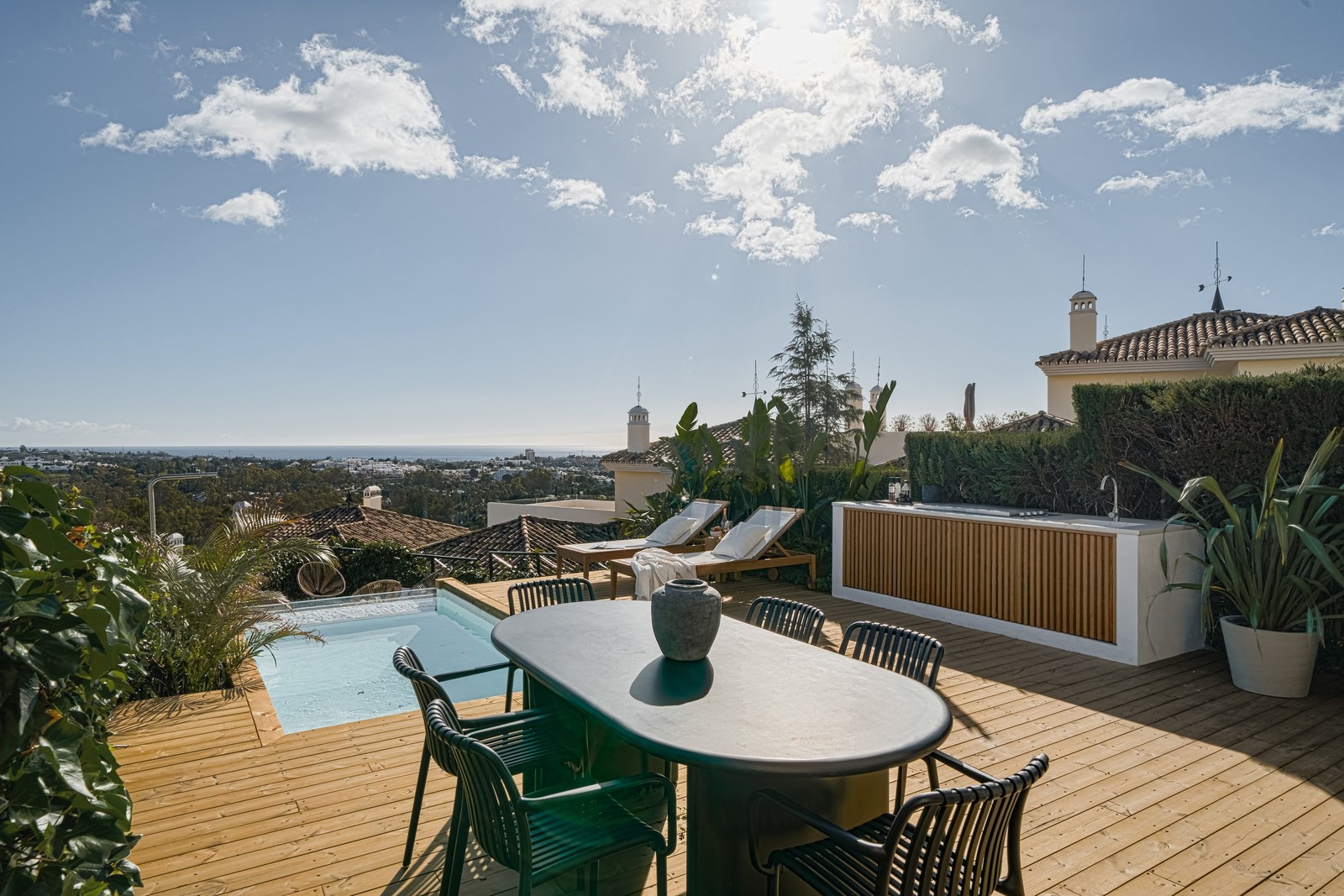 Bostaden har en modern och öppen planlösning med tre sovrum och tre badrum samt generösa sociala ytor där stora glaspartier suddar ut gränsen mellan inne och ute. Den rymliga terrassen om cirka 47 m² erbjuder en privat oas med pool, utekök och fantastisk utsikt över landskapet.