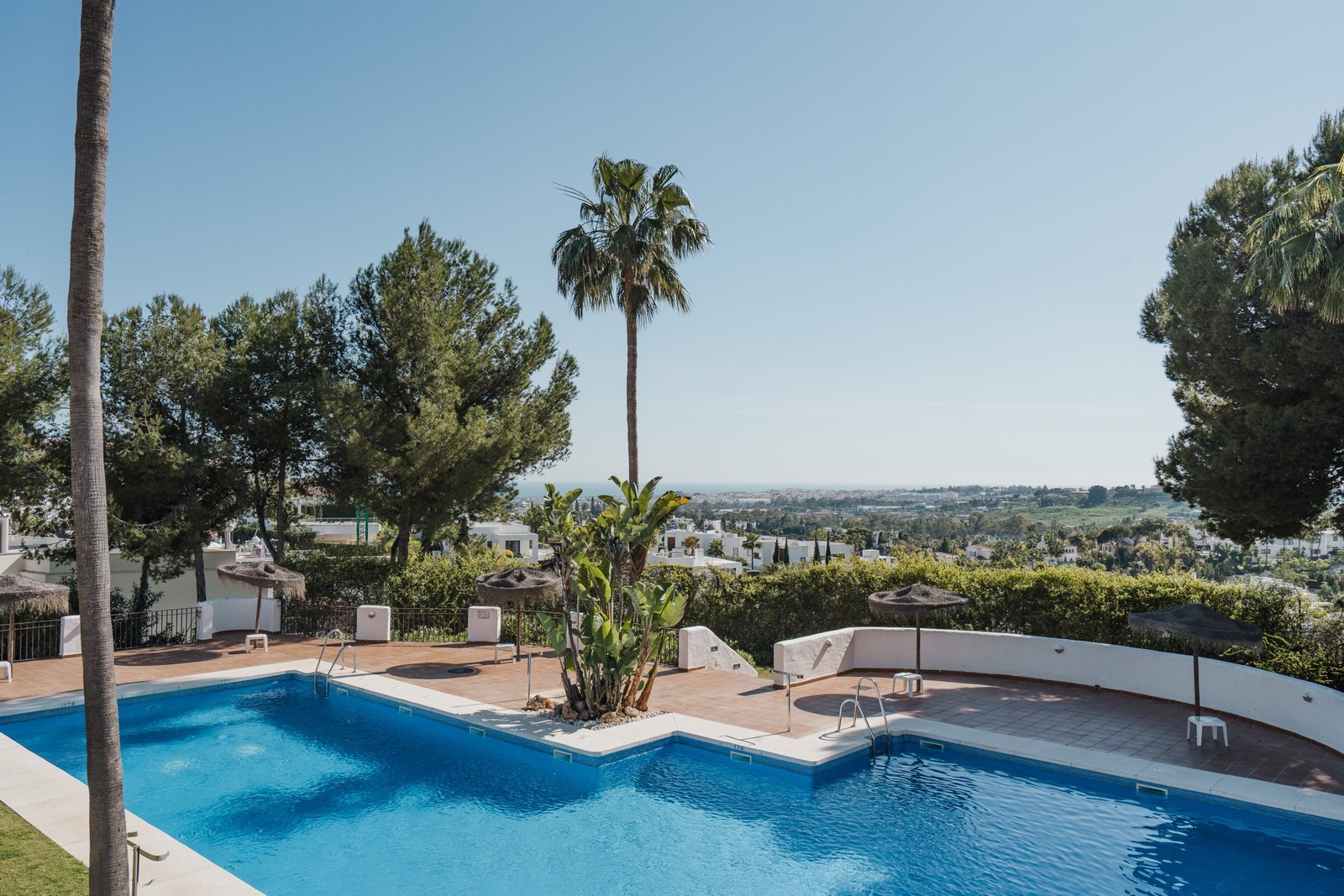 I eftertraktade La Quinta Village i Nueva Andalucía erbjuds denna nyrenoverade marklägenhet som kombinerar modern design med ett lugnt och privat läge. Här bor du i ett gated community omgivet av grönska, med närhet till golfbanor, restauranger och endast några minuter från Puerto Banús.
