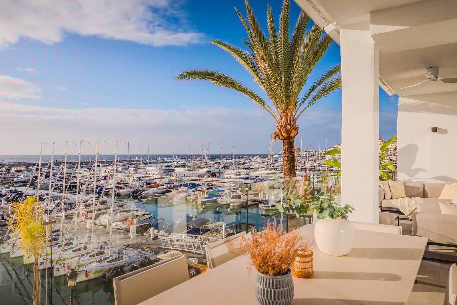 Välkommen till denna ljusa och rymliga takvåning i två plan i Puerto Banús, designad och inredd av en av Marbellas ledande arkitekter. Fastigheten består av ett stort vardagsrum med marmorgolv och belysning, ett rymligt master-sovrum med eget badrum och klädkammare, samt fantastisk havsutsikt. Det finns ytterligare två sovrum med eget badrum, ett gästrum med separat badrum, ett fullt utrustat kök med högkvalitativa vitvaror och gott om förvaringsutrymmen. Det finns också en terrass med utsikt över båtarna och havet. Bostaden säljs fullt möblerad.