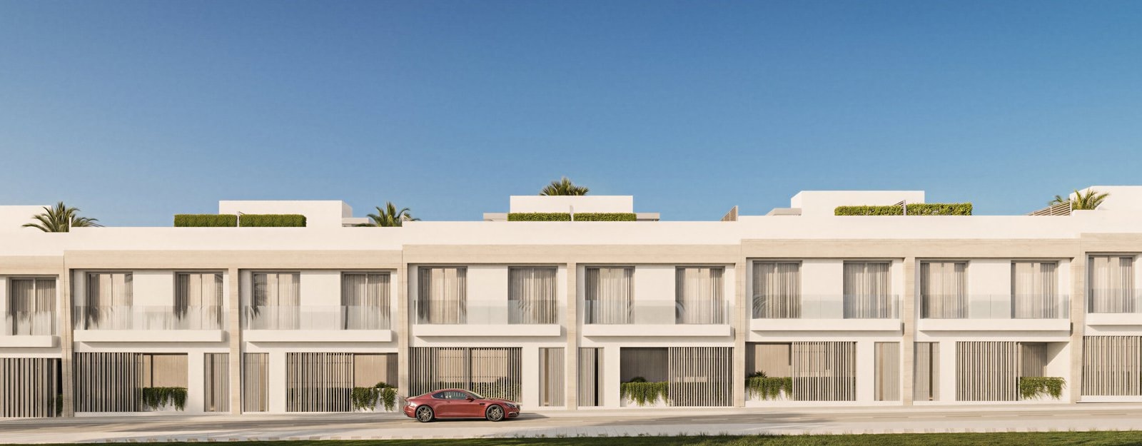 Skapa bevakningStilrena radhus med terrasser, trädgård och gemensam pool i attraktivt område nära golf och strand.