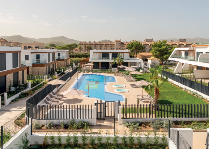 Mitt i området finns en vackert anlagd gemensam poolzon med stor pool, två jacuzzis och solytor omgivna av grönska – en plats för avkoppling och njutning under Mallorcas många soltimmar. För boende finns även parkeringsplatser med förinstallerad infrastruktur för laddning av elbil.