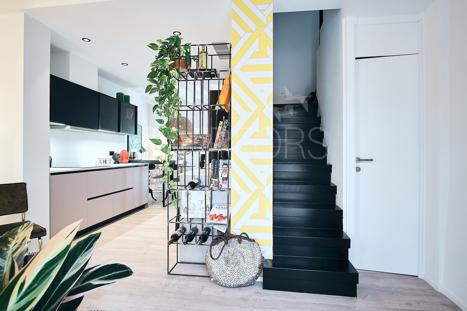 Det här snygga huset ligger på en pittoresk liten gata i Es Jonquet i det populära området Santa Catalina. Man har inrett i en exklusiv stil och varje detalj är väl genomtänkt. På nedre plan finns en entréhall där man kan öppna upp glasdörrarna helt, badrum samt ett kök med öppen planlösning mot matsalen med utgång till en uteplats. Trädgården har ännu inte byggts klart för att man själv ska kunna få välja utformningen, om man tex. vill ha en liten pool eller jaquzzi eller bara grillplats eller kanske använda en del som parkeringsplats.