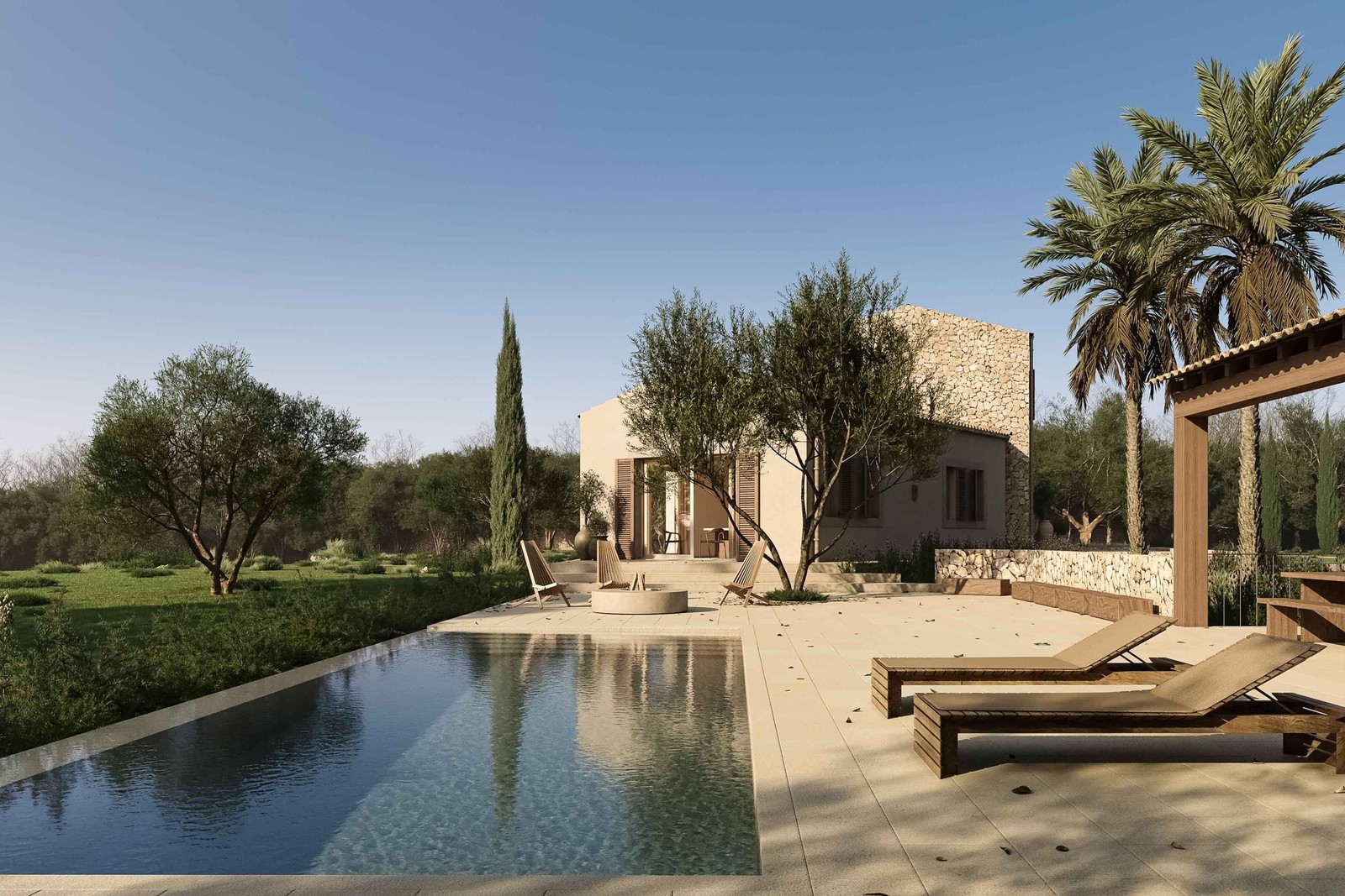 Villan ligger på en en generös tomt på 59.235 m2 och består av en byggnad i tre plan omgiven av en vacker medelhavstädgård. Bostaden är en perfekt symbios av tidlös design och traditionell, rustik mallorkinsk arkitektur, vilket skapar en unik och harmonisk känsla genom hela bostaden. Arkitekten har med stor omsorg och precision arbetat med varje detalj för att skapa en perfekt balans mellan komfort och estetik. Golv och vägg material smälter samman för att ge en känsla av lugn och ro.