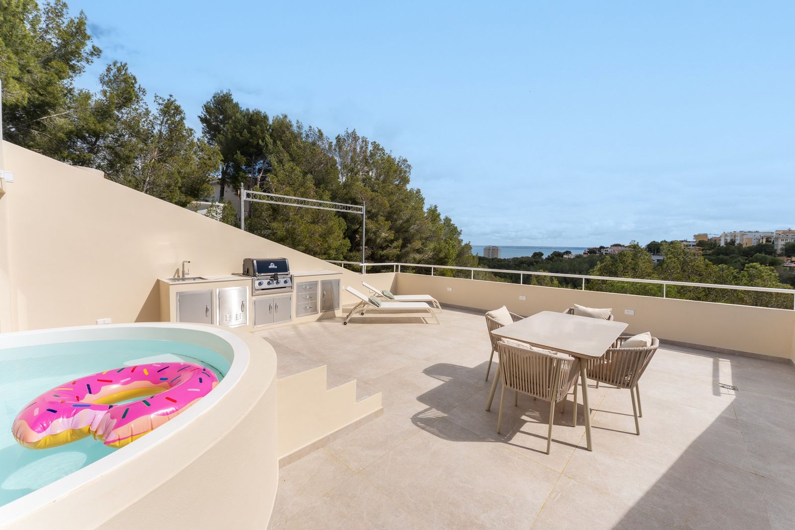 Den verkliga höjdpunkten i denna fastighet är den privata takterrassen med magnifik havsutsikt, ett utomhuskök och en egen pool; en idyllisk miljö för att sociala tillställningar eller för avkoppling med total avskildhet. På samma plan finns ett extra inomhusutrymme som kan användas som hemmakontor eller gästrum. Här finns även en gästtoalett.