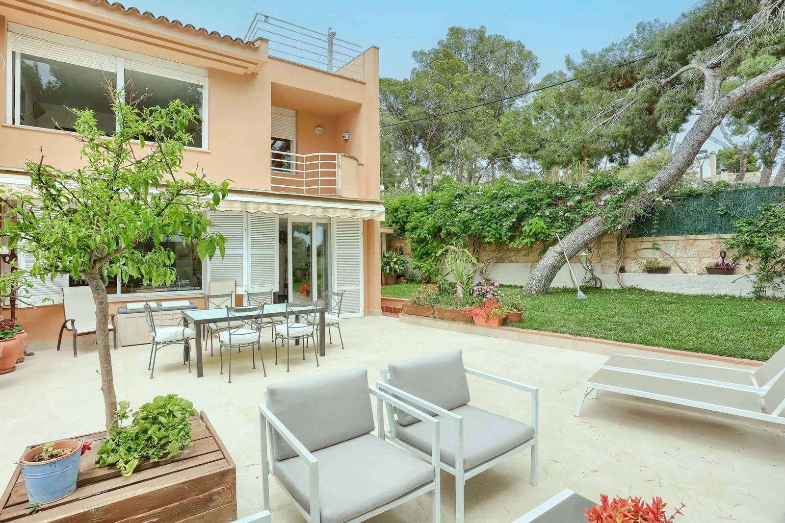 Denna bostad, som väntar på att bli ditt drömhem, erbjuder tre sovrum, två badrum och en praktisk gästtoalett. Med en total byggd yta på 257 m2 och 153 m² i boyta som fördelas över två våningar, finns det gott om plats för hela familjen. På entréplan välkomnas du av ett generöst vardagsrum och matsal som leder till ett stort, separat kök. Köket kan enkelt öppnas upp för att skapa en modern, öppen planlösning. Här finns även en praktisk tvättstuga med gott om förvaring. Från vardagsrummet kliver du ut på den stora privata terrassen med en grönskande trädgårdsdel. En del av terrassen är täckt och erbjuder svalkande skugga under de varma sommarmånaderna. En trappa leder ner till den gemensamma, lummiga trädgården och den nyligen renoverade poolen, som är i perfekt skick.