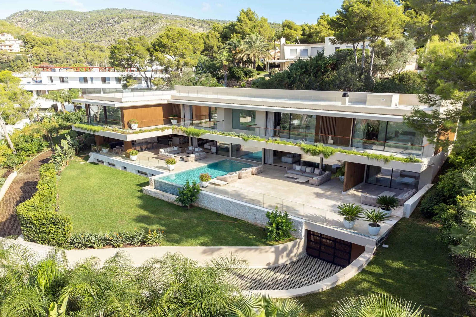 På avstånd glittrar gatlyktor likt ett pärlband mellan hustak och trädkronor och i kvällssolen vid horisonten sträcker sig prestigefyllda Puerto Portals smäckra siluett och påminner om kontinentens närhet. Från den generösa terrassen kan man se det lugna samhället vakna upp till morgonkaffet i gryningen och tystna i månskenet.