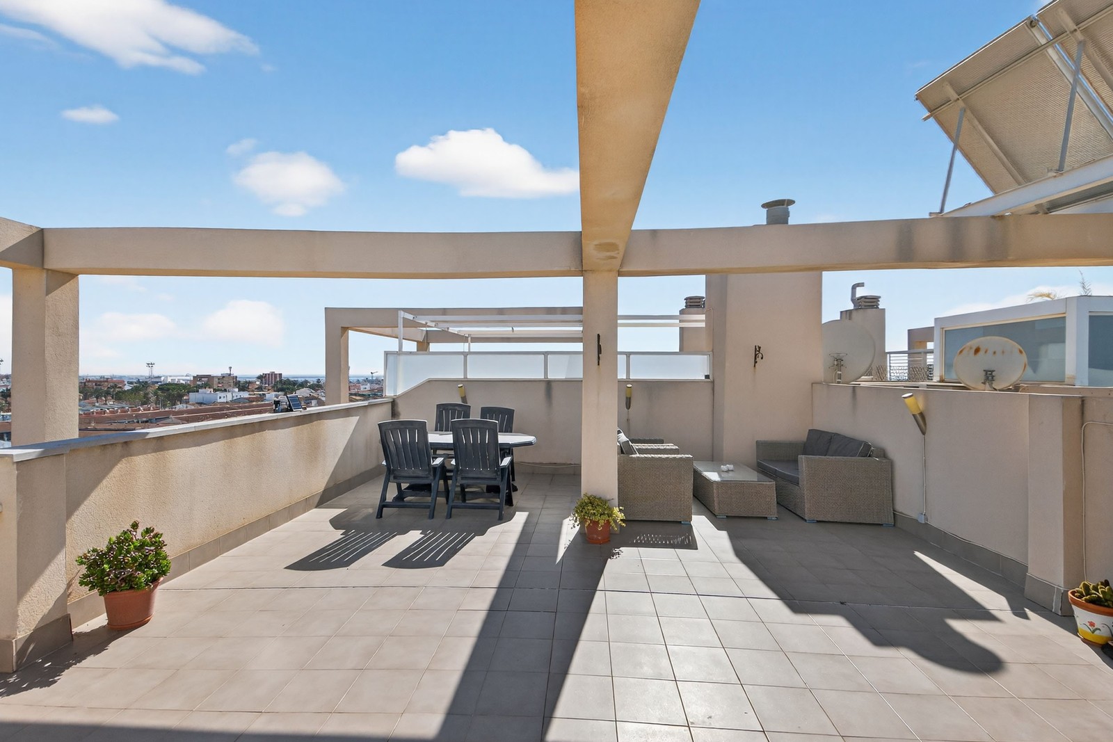 Från balkongen njuter du av en vidsträckt panoramavy över närområdet och bort mot havet. Härifrån leder en trappa upp till den imponerande takterrassen om hela 52 m², bostadens verkliga pärla. Denna generösa yta bjuder in till soliga dagar, långa middagar och umgänge under öppen himmel, med en hänförande utsikt som sträcker sig över landskapet och kustlinjen.