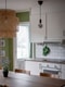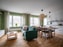 Parkettgolv och gröna målade väggar. Öppen planlösning mellan kök och vardagsrum med både plats för stort matbord och soffgrupp. Stora fönsterpartier ger ett härligt ljusinsläpp.