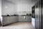 Nu överraskar våningen med ett mycket stort och ljust nyrenoverat kök. Dörren som leder in har spegel med traditionellt råglas. På golvet vilar slipat plankgolv och den sobra inredningen går i vitt och grått med platsbyggda lösningar i vinkel. Arbetsytorna är i rostfritt med bitvis takhöga stänkskydd i vitt kakel, satt i helförband. De formrena fronterna har stiliserade speglar och de påkostade vitvarorna är integrerade med inslag av rostfritt. Ytterligare en sektion med takhög förvaring i original har elegant matchats med samma grå nyans. Här öppnar sig även en stor och öppen matplats. Ljuset faller in från två breda fönsterpartier och här finns utgång till våningens tredje balkong in mot innergårdens lugn.