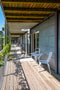 Uteplats i sydvästligt läge på loftgång med plats för två stolar och ett mindre bord eller en sittbänk.