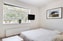 SOVRUM/ALLRUM: Sovrum/allrum erbjuder dubbelsäng samt soffa och en utfällbar säng monterad på väggen ovan soffan. Väggarna är vitmålade och det stora fönstret släpper in härligt naturligt ljus utifrån.