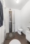 Smakfullt renoverat badrum med spegelskåp, dusch med vikväggar. Grått mosaikgolv samt vitt kakel på väggarna, förutom i duschdelen där samma mosaik som på golvet återfinns.