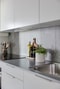 Öppet kök med köksinredning i vitt utförande, ljusa väggar och stänkskydd i grått utförande. Välplanerat kök med goda arbetsytor och bra förvaring i bänk- och väggskåp. Den maskinella köksutrustningen består av spishäll, spisfläkt, kombinerad ugn och mikrovågsugn samt kyl och frys. All maskinell utrustning är i rostfritt utförande. I anslutning finns det plats för ett matbord.