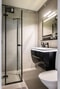 Det lyxiga badrummet har golvvärme och utförande i grå klinker som förenats med nutida svart takdusch och tvättställsblandare. Badrummet är försett med spotlights, handdukstork och spegel med belysning. Sovrummet ligger intill, stort och ljust med plats för både säng, byrå eller skrivbord. En hel garderobsvägg finns här att förvara prylar och pinaler i. Tillhörande finns även ett bra förråd på källarplan. I vardagsrummet ryms såväl matgrupp eller arbetsplats jämte soffgrupp - ett stort sällskapligt rum!