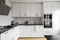 Stor och socialt kök där det finns plats för ett större matbord för många gäster. Köket från IKEA renoverades 2022 och har stilrena vita luckor, vitt kakel och mörk bänkskiva i laminat. Vitvaror enligt följande: kyl/frys, spis, ugn, diskmaskin, fläkt och mikro, samtliga från Elektrolux 2022.