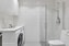 Badrummet är helkaklat i vitt och grått. Här erbjuds WC, dusch, handfat med kommod, spegel, tvättmaskin, torktumlare samt förvaring. Det finns en praktisk bänk ovanför tvättmaskinen som passar perfekt att vika tvätt på.