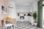 Det trivsamma köket är traditionellt stilrent med ljusa skåpluckor och lådor mot gjutna bänkskivor med vitt struktur kakel på vägg. Matplats invid vägg med vy mot balkongdörrarna i glas. Den maskinella utrustningen inkluderar kombinerad kyl/frys, spis, fläkt, diskmaskin och ugn. Väggarna är målade i harmoniskt rosa ton mot golvmatta i en charmig grå-vit-rutig funkis stil.