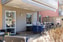 uteplats trätrall, delvis under tak. det är trätrall på hela ytan. Insynsskydd på sidorna.