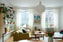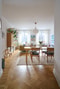 Vardagsrum där rymd och ljus får ta plats. De dubbla fönsterpartierna släpper in gott om dagsljus som faller över originalparketten i fiskbensmönster. Här finns utrymme för både två soffor och en matgrupp för fler personer. Planlösningen ger bra möbleringsmöjligheter och fungerar som en naturlig samlingspunkt i vardagen.