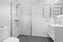 Helkalkat badrum med klinkergolv och tillhörande golvvärme. Duschvägg, tvättställ med kommod, spegelskåp, handdukstork och WC med installerad tvättmaskin och spotlights i taket.