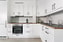 Kök: Modernt kök som är utrustat med häll, integrerad ugn, fläkt, kyl/frys med kakel ovanpå diskbänk och arbetsytor. Ljust laminatgolv med vitmålade väggar.