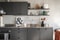 Stilrent kök i modern design med mörka skåpsluckor och arbetsytor i rostfritt stål som förstärker bostadens industriella uttryck. Köket är utrustat med induktionshäll, ugn, fläkt, kyl/frys samt diskmaskin och erbjuder gott om både arbetsyta och förvaring. Väggarna består av målade vita ytor tillsammans med synlig betong, och på golvet ligger samma brädgolv som i övriga bostaden.