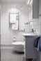 Helkaklat badrum från stambytet 2018/2019. Badrummet är fullt utrustat med vägghängd wc, dusch med vikbara väggar, vit kommod, spegelskåp för förvaring och förberett med avlopp tvättmaskin. Ljusgrått klinkergolv och vitt kakel på väggarna.