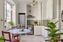 Charmigt originalkök i vit färg med kakel i grågrön färg ovanför bänkskiva i rostfritt och trä. Köket är utrustat med spis, fläkt, ett charmigt originalskåp, kyl och frys. I köket ryms även plats matbord.