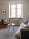Vardagsrummet har en luftig karaktär med ca 2,85 meter i takhöjd, stora fönsterpartier och gråmålade väggar som framhäver den klassiska fiskbensparketten. Här finns plats för både soffgrupp och matsalsbord, och originaldetaljer som fönsterbräda i sten bidrar till den tidstypiska känslan. Sovrummet ligger rofyllt och avskilt, med utgång till en balkong mot den grönskande gården. Här ryms dubbelsäng, arbetsplats och förvaring i både platsbyggd bokhylla och originalgarderob.