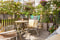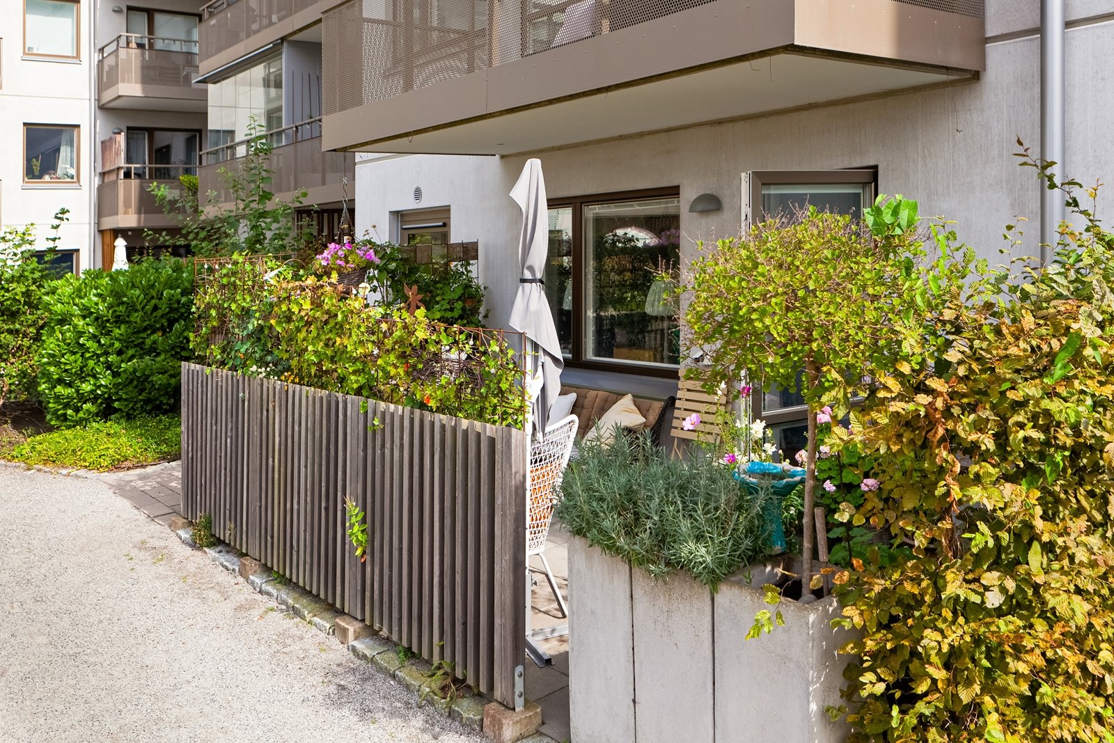 Gården är ombonad med vackra planteringar och stenläggningar. Här finns två pergolor med sittplatser, grillplats och en liten lekplats för de minsta.
