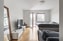 Köket har parkettgolv och väggar målade i en ljus färg. Inredningen består av vita skåp med gott om förvaring och en arbetsbänk i mörk ton. Ovan bänken finns ett kaklat stänkskydd i en neutral färg. Utrustningen omfattar spis med ugn, fläkt, integrerad diskmaskin, kyl och frys samt inbyggd mikro. En öppning mot rummet intill ger extra ljus till köksdelen.