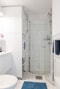 Till vänster om hallen ligger det helkaklade badrummet. Fräscht, ljust och genomgående fina materialval. Badrummet är utrustat med toalett, dusch, spegel, handfat med underliggande förvaring.
