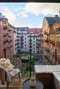 Gedigna brädgolv och gröna väggar. Smart platsbyggd förvaring och direkt utgång till bostadens härliga balkong. Balkongen ligger i västerläge där solen strålar mellan ca 11:30-18:00 på sommarhalvåret.
