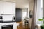 Smakfullt kök med plats för matbord för upp till fyra personer. Bakom vita, släta skåpsluckor döljer sig generösa förvaringsutrymmen. Köket är fullutrustat med kyl/frys, ugn, induktionshäll och diskmaskin. Den mörka bänkskivan erbjuder gott om arbetsyta och skapar en elegant kontrast mot de ljusa ytorna.