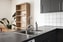 Köket är i stilrent utförande med modern köksinredning och gott om arbetsyta och förvaringsmöjligheter. Släta luckor i mörkgrått och mörk bänkskiva som snyggt bryts av med vitt kakel upp till taket. Maskinell utrustning bestående av diskmaskin, fläkt, inbyggd ugn och mikro, spishäll samt kombinerad kyl och frys.