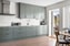 Köket från Marbodal är modernt och har genomtänkta funktioner. Släta luckor i en dov grön kulör, bänkskiva i laminat och vitt kakel på stänkpanelen. Här har tillval gjorts i form av bland annat infällda spotlights, uppgraderad fläkt samt rostfria vitvaror. Den maskinella utrustningen består av inbyggd ugn och mikro, integrerad diskmaskin samt kyl och frys. Tack vare bostadens gavelläge är rummet ljust och luftigt, med gott om plats för både soffa och matbord. Golvet pryds av vitpigmenterad ekparkett och väggarna är målade i en ljus kulör. Gardinskenor i tak, anpassade efter rummet, samt lamellgardinerna i fönstren stannar kvar i bostaden.